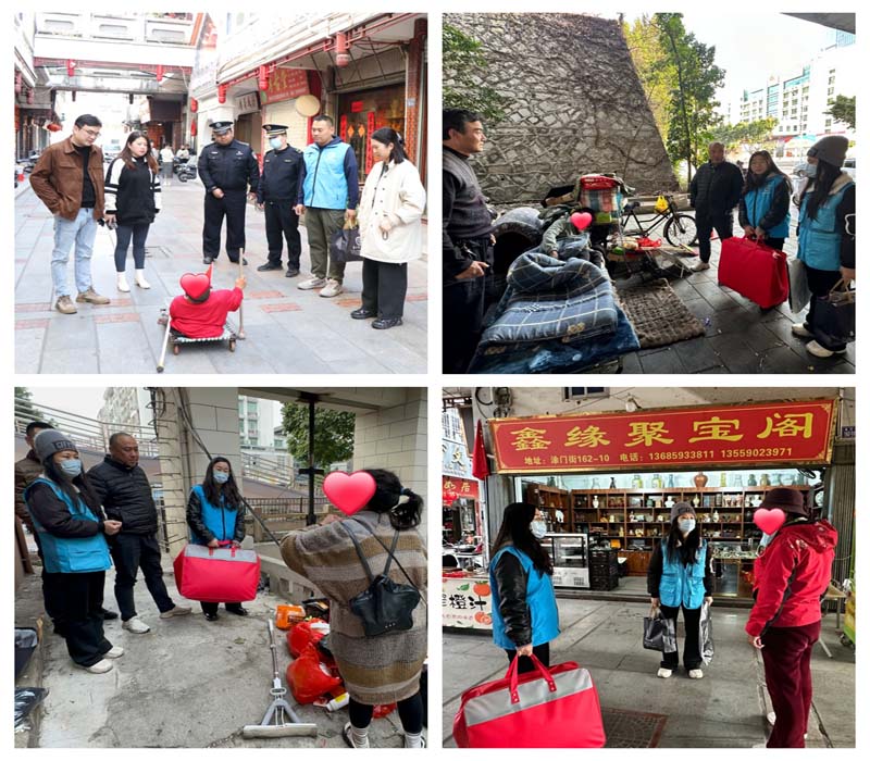 强化街面巡查,精准劝导救助。以街面流浪乞讨人员救助服务工作为重点,全面加强巡查与劝导力度通过深入主次干道、桥梁涵洞、景区周边、车站广场等流浪乞讨人员易出没区域,做到全方位排查、全覆盖救助。工作人员随身携带开水、热食及保温物资,同步备好包含厚外套、保暖内衣、保温杯、急救用品、食品、暖宝宝、防护用品在内的春节爱心大礼包,第一时间为流浪乞讨人员送上热食热水,耐心劝导返乡与家人团聚或入站接受集中救助。对于不愿入站接受救助的对象,及时送上春节爱心大礼包,告知救助热线做好后续跟踪关注。同时,积极联动街道、社区等多方力量,压实属地责任,协同做好流浪乞讨人员的巡查走访、宣传劝导工作