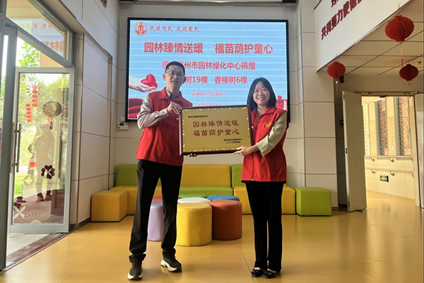 活动开始前,市园林绿化中心向市社会福利中心捐赠了一批优质树苗,希望以党建为纽带、以绿荫为载体,共同守护“一老一小”成长环境。市社会福利中心向市园林绿化中心回赠了爱心牌匾。
